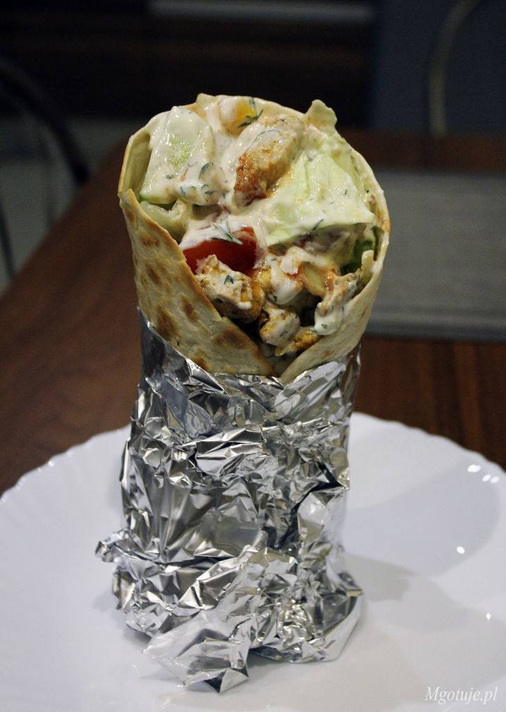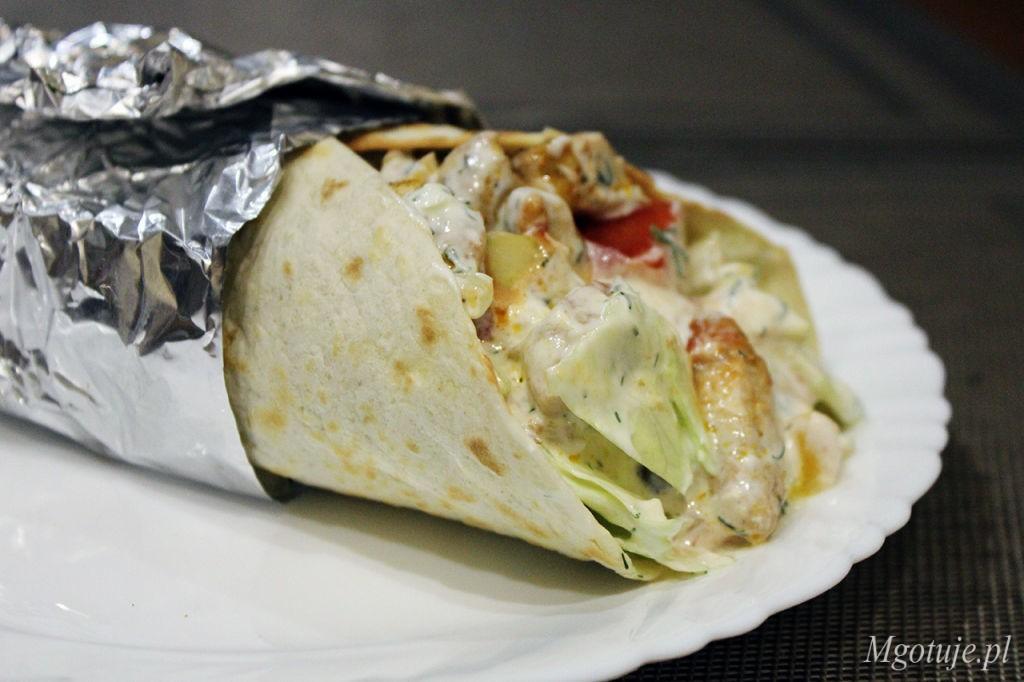 Pierś z kurczaka kroimy na małe kawałki, przyprawiamy solą, pieprzem i przyprawą do gyrosa. Odkładamy do lodówki na 30 minut.Sałatę drobno szatkujemy. Paprykę myjemy, osuszamy i kroimy w cienkie paseczki. Ogórek kroimy w cienkie plasterki. Pomidora kroimy na mniejsze kawałki. Cebulę kroimy w pół talarki.Sos czosnkowy:W misce mieszamy majonez z jogurtem. Dodajemy czosnek przeciśnięty przez praskę, koperek i dokładnie mieszamy.Zamarynowaną pierś z kurczaka smażymy na rozgrzanym oleju na patelni przez kilka minut. Na suchej i rozgrzanej patelni podgrzewamy placki tortilli. Na każdym placku układamy garść sałaty, pokrojone warzywa, kawałki kurczaka. Polewamy całość sosem czosnkowym i ketchupem. Zwijamy.Smacznego 🙂